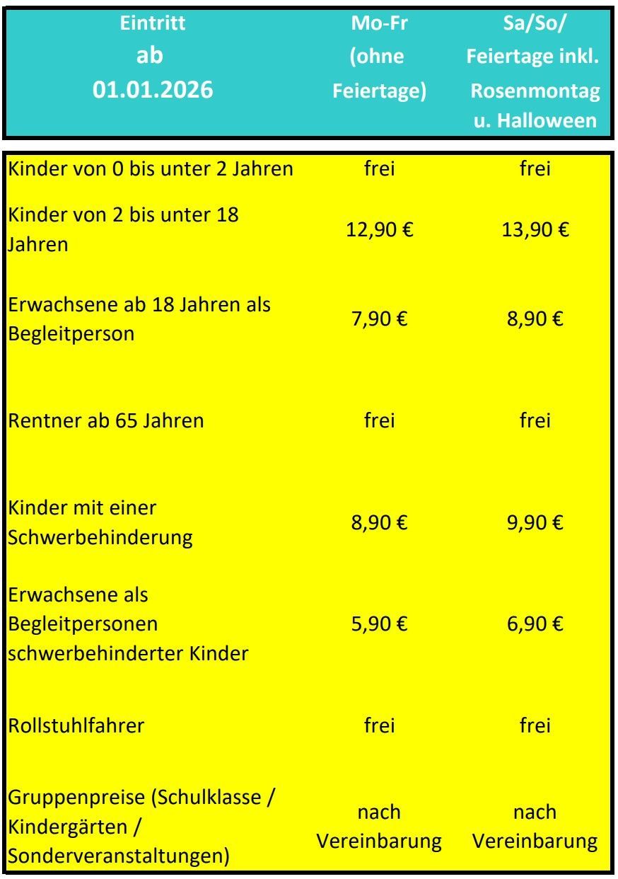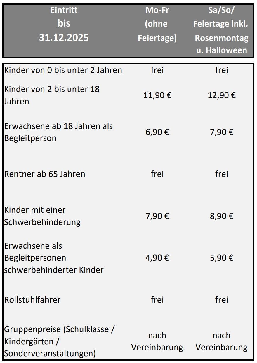 | Gruppenpreise (Schulklassen / Kindergärten / Sonderveranstaltungen) | nach Vereinbarung | nach Vereinbarung |